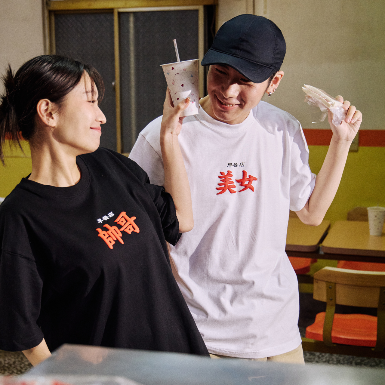 Front: Giant, bold Traditional Chinese characters for "HANDSOME" (帥哥) or "BEAUTY" (美女). It's an instant ego boost.